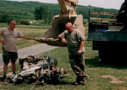 Délután ¾1 volt, amikor a markológép áthozta a motort a krátertől. A kanálra függesztett szerkezetet két oldalról Janó és Groszi biztosította a belengés ellen. A gép hangjára mindenki abbahagyta a beszélgetést és a különös menetet figyelte. Minden jelenlévő kamera, fényképezőgép arra fordult. A roncsok elszállítására nemrégen megérkezett szolnoki URAL teherautó, mely most az öltöző előtt állt, előrébb gurult, hogy a motor felhelyezéséhez kényelmesebb legyen a hely. Gyorsan lenyitották a plató végét és feltekerték a ponyvát, hogy a gép egyenesen a helyére tehesse terhét, de jött Magó Karesz és földre parancsolta a motort, mert megérkeztek a tűzszerészek. Rövid megbeszélés után körbeállták a DB605-öt. A locsolótömlőt megkurtították, hogy a gépágyút jobban le lehessen tisztítani és hozzáférhetőbbé tenni. Miután végeztek a vizsgálódással a motor, tényleg az URAL platójára került.