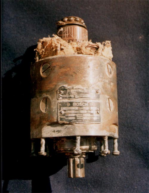 Másnap… A napi munka végeztével valósággal átvonzott bennünket a betemetett kráter, megnézni a kutatás helyét. Földváron a polgárőröktől kértünk műanyag szalagot, hogy körbekeríthessük a kráter és munkaterület helyét annak veszélyessége miatt. Figyelmeztető feliratot is készítettünk. A cölöpök leverése és a szalag kihúzása után jobban átnéztük a területet. Az egyik föld, illetve sárgombóc túlságosan nehéz volt. Egy darab ággal megtisztítva furcsa tárgy került elő. Rövid időn belül rájöttem, hogy a Messzer generátorát találtuk meg. Természetesen nem beépíthető állapotban volt. A kollektor felöli pajzs és a meghajtás felöli oldal is hiányzott. A Trabantba tettük a leletet. Hazaérve azonnal a kerti locsoló alá került. Rozsda nem volt rajta. Egy széles bilincs viszont igen. Két 10-es csavart kellett meglazítani, hogy levehető legyen, ugyanis a lemez alatt alumínium csíkot véltem látni, azaz adattáblára számítottam. Nem csalódtam. A lemezcsík a becsapódáskor rácsúszott az adattáblákra és megvédte azokat az enyészettől. Az egyik teljesen ép. A másiknak, a lemez alól kilógó része a környező anyagokkal reakcióba lépett és elporlott. A meghajtás felöli oldalon nyeles tengelyben végződött a forgórész, rajta a csapágy ép és forgatható.