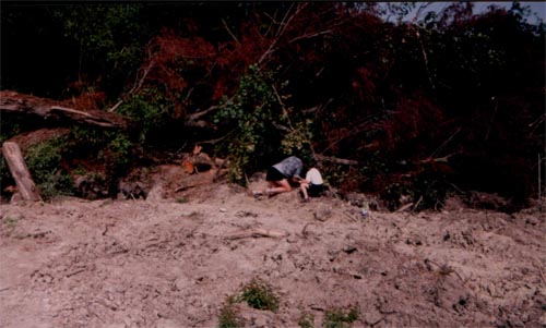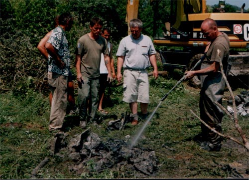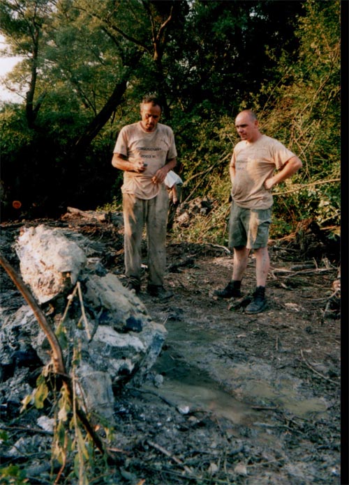Másnap reggel folytatódott a feltárás. A kráterben kb. kétméteres víz gyűlt össze. Mivel sajnos szivattyút nem lehetett szerezni a nagy pénztelenségben, a feltárás a markológéppel történt. A partra kitermelt iszapot fémkeresővel vizsgálták át és kézzel bányászták ki az alkatrészeket. A felgyűlt víz mosó hatása még veszélyesebbé tette a kráter szélét. A kíváncsiskodókat biztonságos távolságba kellett küldeni. Az óriás soktörzsű fűzfát is alámosta a víz. Gyökerein állva éreztem és hallottam, hogy pattog a fa és lassan milliméterenként emelkedik velem a talaj. A hatalmas ágak a keletkezett kis tó fölött voltak és nagy veszélyt jelentettek emberre, gépre egyaránt. Tenni kellett valamit. Ismét a helyiek segítettek. Nagyon rövid idő múlva egy fiatal srác jelent meg motoros fűrésszel és pár perc alatt ártalmatlanná tette a hatalmas korhadt fát. Nyugodtan dolgozhatott a gép tovább.