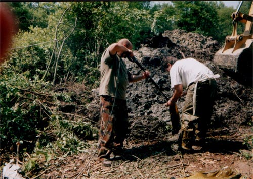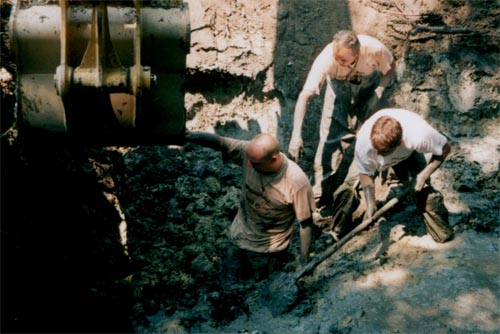 Negyed tízkor elhangzott az indulási „parancs”. A markoló óvatosan megkezdte a talaj kiszedését a kráterből. Ez a föld végül is sár volt keverve az évtizedek alatt belehullott falevél elrothadt részeivel és sajnos a sok beledobált szeméttel vegyesen. Ehhez hozzájött a már felgyűlt talajvíz.