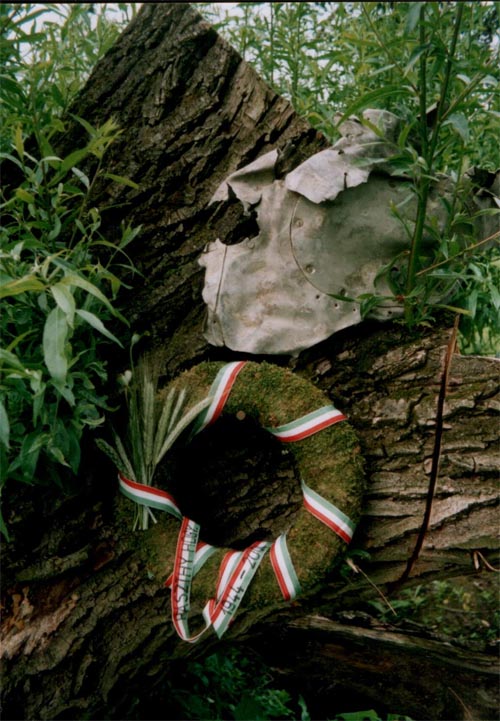 Röviden ennyit a magánkutatásainkról. Közben az idő múlott. A kráter környéke megváltozott. Feltöltésre került a terület nagy része. Az ásatás helye érintetlen. A hadnagy halálának 60. évfordulójára a tervezett emlékmű nem valósult meg, de építése megkezdődött. Az esemény után hatvan évvel, a történés perceiben megemlékeztünk a tragédiáról. Bruki családja és az én családom megkoszorúztuk a krátert. A szolid koszorú a becsapódás helyén nőtt fa csonkjaira került. Érdekes, megható érzés volt.
